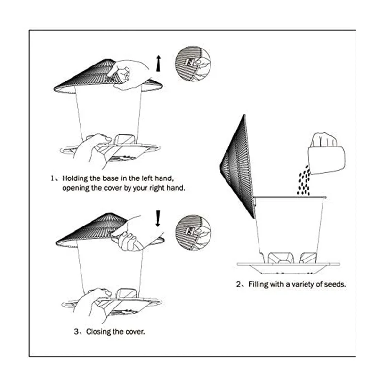 【SCENES TO BE USED】Open the lid, put the wild bird seeds, sunflower seeds for birds, safflower bird seed etc, into the bird feeder, close the lid, and then hang the bird feeder under the eaves or in the garden.