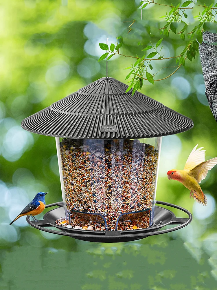 【 HUMANIZED DESIGN 】Comes fully assembled and ready to hang. With its circular roof, the birdfeeder features an inclined roof to shade birds from the sun and rain. When the seeds are eaten, more seeds will naturally fill the tray.The tray has leaking holes to avoid water accumulation and keep the food dry.
